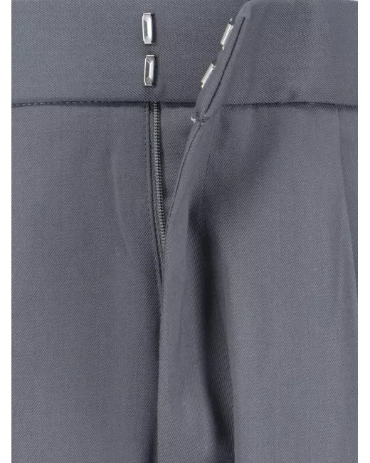medium grey twill weave hook and zip fly fastening rear elasticated waistband mid-rise pleat detailing two side slit pockets two rear jetted pockets tailored cut