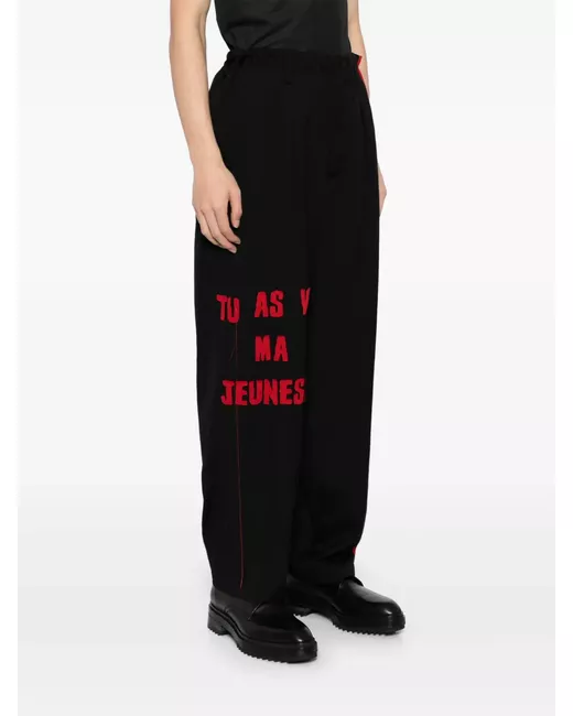 black wool blend front button and zip fastening belt loops internal drawstring fastening waist pressed crease two side inset pockets patchwork design two rear button-fastening pockets adjustable strap to the rear stripe trim