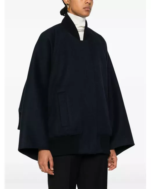 oxford blue cashmere brushed effect front press-stud and zip fastening ribbed trim baseball collar long batwing sleeves two side welt pockets logo-jacquard lining straight hem