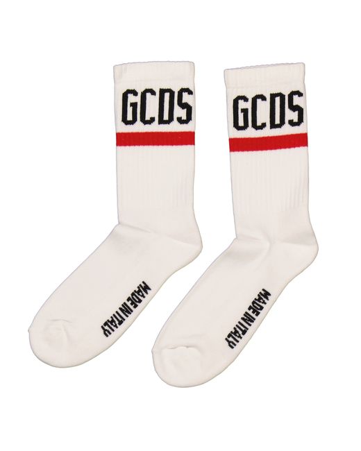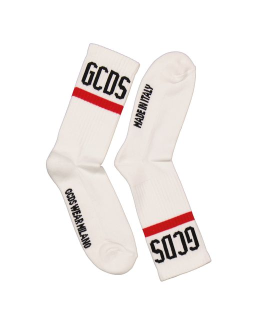 GCDS Mens Undergarments. SKU: CC94M010024-01. Color: White. GCDS Logo Brand White Socks. These cotton blend socks are designed with an inlaid GCDS logo and contrasting linear patterns. 85% Cotton, 10% Polyamide, 5% Elastane Made in Italy