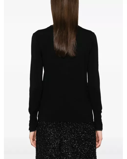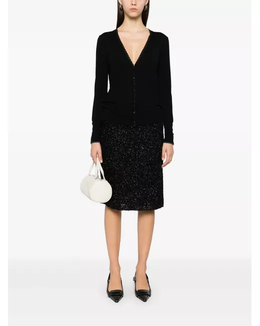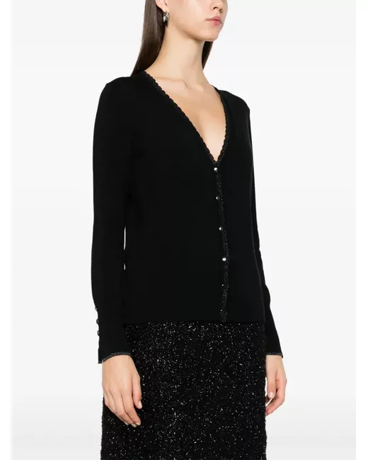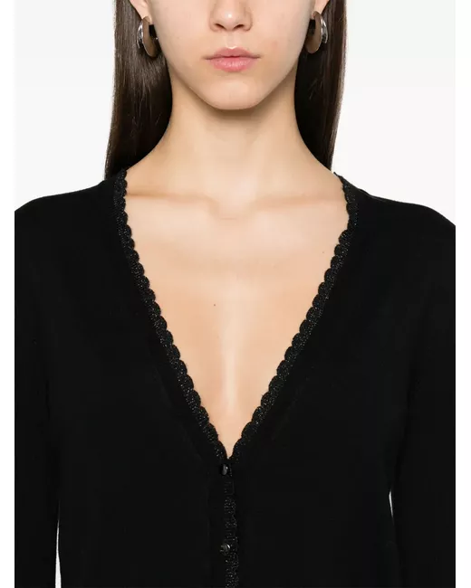 black fine knit front button fastening V-neck with scallop edge lurex detailing long sleeves split cuffs decorative button detailing to the cuffs ribbed cuffs crystal-logo embellishment to the back ribbed hem