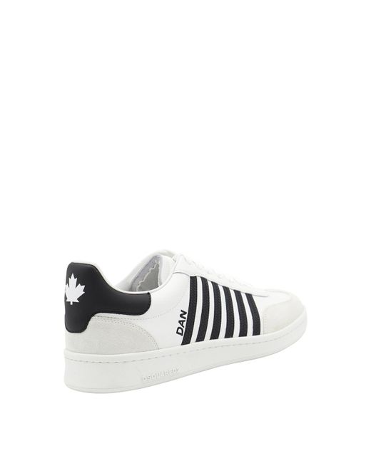 White sneakers from dsquared featuring round toe laces lateral stripes logo