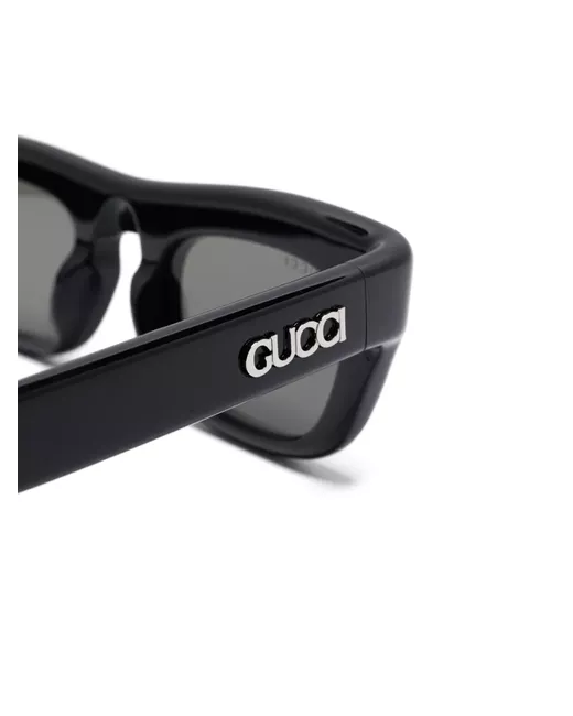 black acetate high-shine finish rectangle frame tinted lenses UV-protective lenses lens decal logo lettering straight arms curved tips These glasses come with a protective case.