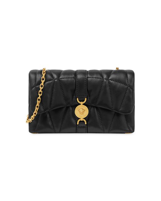 Versace's Mini Quilted Kleio bag is crafted of lambskin leather in Italy. Removable chain shoulder strap Flap with magnetic interlocking closure Leather Lining: cotton Made in Italy SIZE About 7.5"W x 4.7"H x 2.4"D ABOUT THE BRAND Founded in 1978, Versace is instantly recognizable by the signature Medusa head logo, chosen by founder Gianni Versace for its Greek symbolism. The Italian label is known for its luxe, bold clothing and accessories-think gilding, oversized logos and punchy prints. Since taking over artistic direction, Gianni's sister Donatella Versace has maintained the brand's strong identity, with a renewed vision to give customers the ultimate freedom to express themselves. Handbags - Italian Designers > Versace > Saks Fifth Avenue > Barneys. Versace. Color: Black Versace Gold.