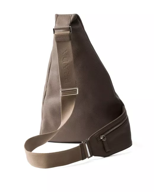 taupe grey calf leather grained texture zip fastening adjustable shoulder strap enamel triangle logo front zip fastening pockets main compartment full lining internal zip-fastening pocket internal logo plaque