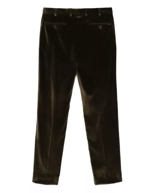 fern green cotton blend velour front button, concealed hook and zip fastening belt loops pressed crease coin pocket two diagonal pockets to the sides two rear button-fastening pockets unlined tapered leg