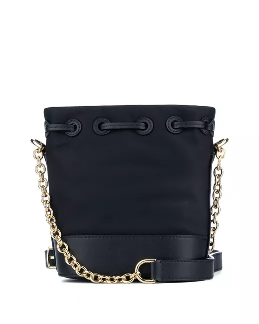 black drawstring fastening leather and chain-link shoulder strap logo plaque leather trim gold-tone hardware internal zip-fastening pocket