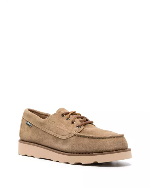 Marrone cammello, pelle scamosciata di vitello, cuciture tono su tono, mini targhetta con logo, punta tonda, chiusura frontale con lacci, soletta con logo e suola in gomma.
