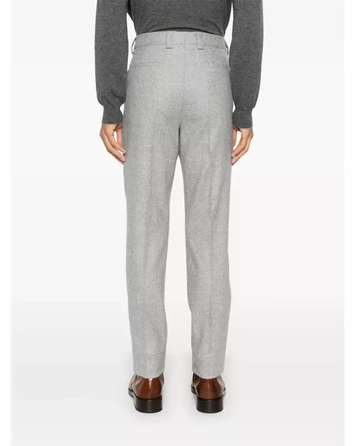 light grey concealed front button, hook and zip fastening belt loops two side slit pockets two rear welt pockets