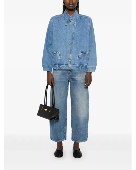 cerulean blue front button fastening shoulder pads two rounded pockets to the sides elasticated hem