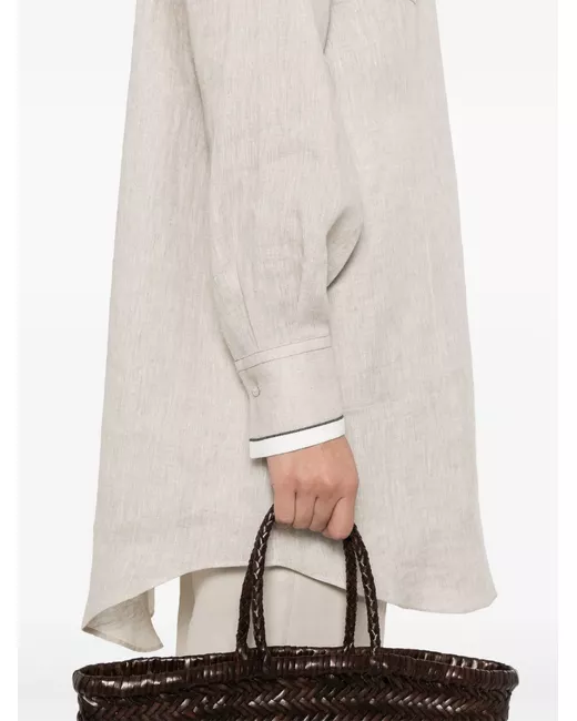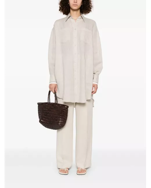beige chiaro chiusura frontale con bottoni due tasche applicate sul petto dettaglio con pieghe a cannone colletto classico