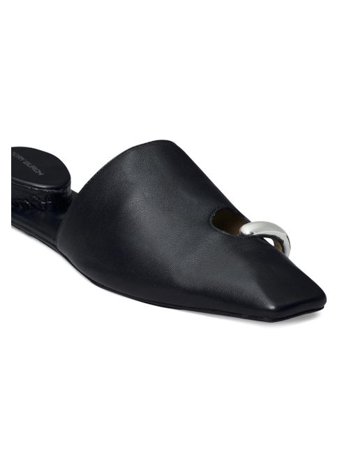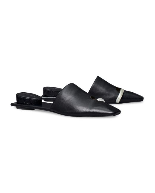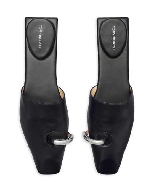 Crafted of supple leather, these Tory Burch mules feature goldtone piercing hardware and a slim square toe. Square toe Slips on Leather upper Leather sole Imported SIZE Stacked heel: about 1.25" (30mm) ABOUT THE BRAND Since debuting her brand in 2004, New York-based designer Tory Burch has made an impact on the fashion world with her handbags and shoes, and playful-yet-polished clothing. Today, Burch remains inspired by color and travel, with her vibrant collections bursting with prints, and her instantly recognizable double-T logo drawing from Moroccan architecture. Women's Shoes - Tory Burch Womens Shoes > Tory Burch > Saks Fifth Avenue > Barneys. Tory Burch. Color: Perfectblack. Size: 10.