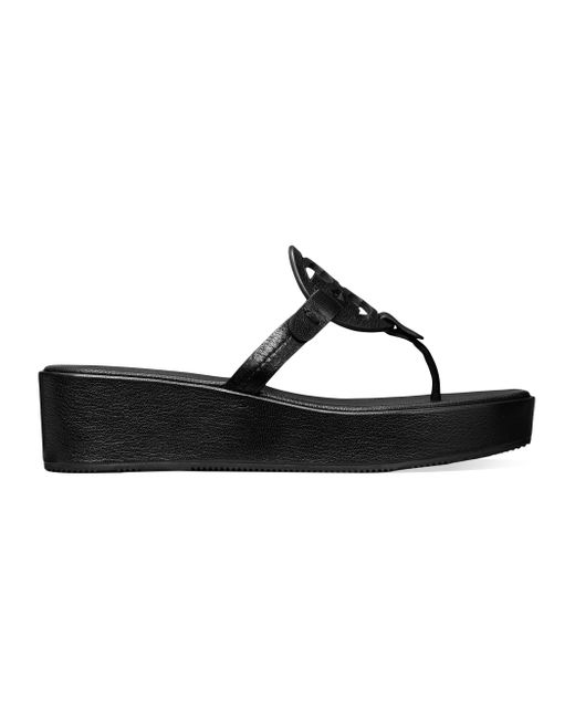 Tory Burch's Miller wedge sandals are crafted of leather and sit on a ribbed TPU sole for added traction. The label's iconic Double T logo adorns the vamp. Open toe Slips on Leather upper Leather lining Thermoplastic polyurethane sole Imported SIZE Wedge heel: about 1" (25mm) ABOUT THE BRAND Since debuting her brand in 2004, New York-based designer Tory Burch has made an impact on the fashion world with her handbags and shoes, and playful-yet-polished clothing. Today, Burch remains inspired by color and travel, with her vibrant collections bursting with prints, and her instantly recognizable double-T logo drawing from Moroccan architecture. Women's Shoes - Tory Burch Womens Shoes > Tory Burch > Saks Fifth Avenue > Barneys. Tory Burch. Color: Black. Size: 10.