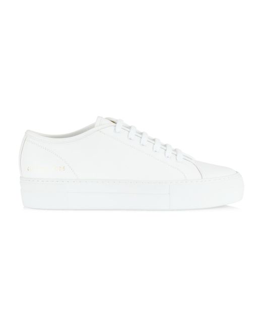 Set on a platform sole, Common Projects' Tournament sneakers are stamped with signature foil numbers. Round toe Lace-up style Leather upper Leather lining Rubber sole Made in Italy SIZE Platform, about 1.25". Women's Shoes - Sneakers > Common Projects > Saks Fifth Avenue > Barneys. Common Projects. Color: White. Size: 5.