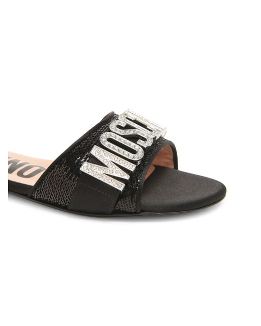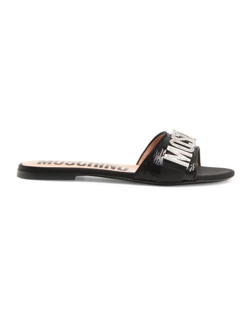 Made in Italy, these mules from Moschino are decorated with sequins and bold, crystal-embellished logo lettering. Open toe Slips on Textile upper Leather sole Made in Italy. Women's Shoes - Designer Womens Shoes > Moschino > Saks Fifth Avenue > Barneys. Moschino. Color: Black. Size: 5.