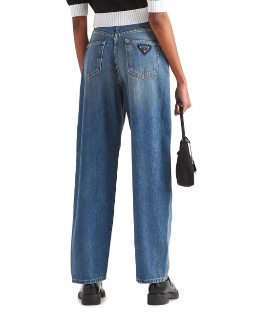 These jeans with a boyfriend cut, high waist, and wide leg are treated to create a worn, used effect that gives them vintage allure. Contrasting top-stitching outlines the five-pocket style that is accented on the back with the emblematic enameled metal triangle logo. Washed denim Masculine cut High waist Hem width 20.5 cm, Size 25 cm Button fly Contrasting topstitching Rounded front pockets with coin pocket Back patch pockets Total length: 110 cm Size: 25 cm Enameled metal triangle logo Imported 100% Cotton. Lsd Rtw - Prada Rtw > Prada > Saks Fifth Avenue > Barneys. Prada. Color: Blue. Size: 24.