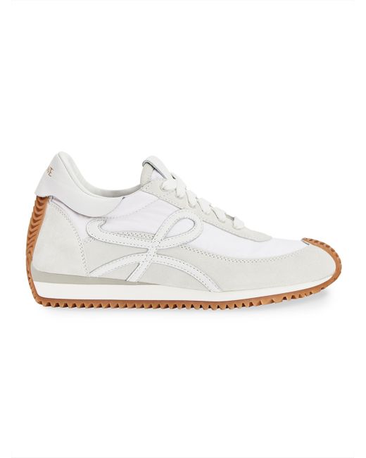 Mounted on a rubber wave sole that curves to the back of the heel, this low-top sneaker is decorated with an L monogram at the sidewall and a foil-stamped logo at the counter. Suede/leather/nylon upper Round toe Lace-up vamp TPU sole Made in Italy Please note: This item runs small. Women's Shoes - French Designer > Loewe > Saks Fifth Avenue > Barneys. LOEWE. Color: White. Size: 5.
