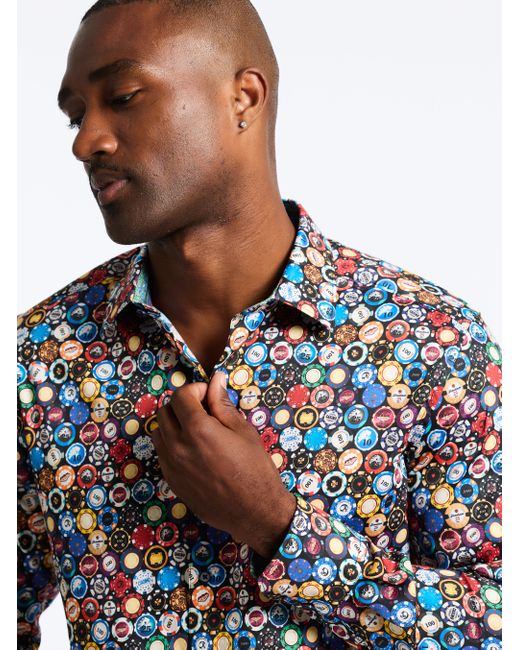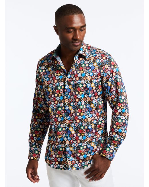 You're a highroller and you're raising the stakes of a basic button-down style. Look closely and see that the large circular pattern is actually made up of poker chips in an array of colors and styles. Point collar Full button front Poker chip print Contrast print at collar and cuff Long sleeve Button cuff Shirttail hem 97% cotton, 3% spandex Machine wash cold Imported
