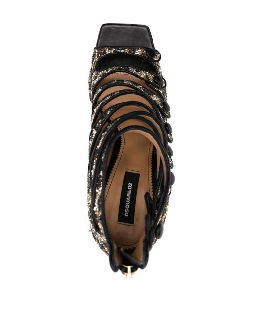 Take a walk on the wild side. These leopard-print sandals from Dsquared2 will add a bold touch to your look. Send your style-impact to new heights. Highlights brown/black leather glitter detailing leopard print open toe square toe front press-stud fastening branded insole 120mm high block heel