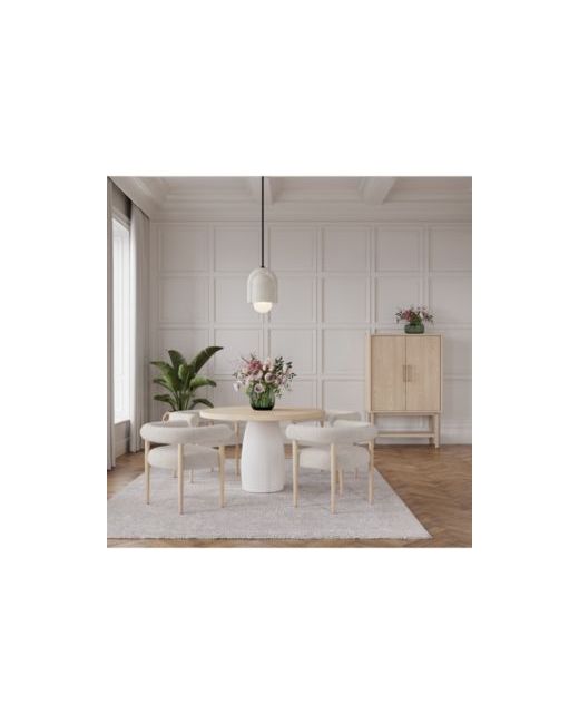 Elegant and refined, the Lunare round dining set features a natural ash wood veneer in a light white sand finish. Accented with soft brass tones, it brings warmth and sophistication to any decor, inviting you to dine in style and comfort.