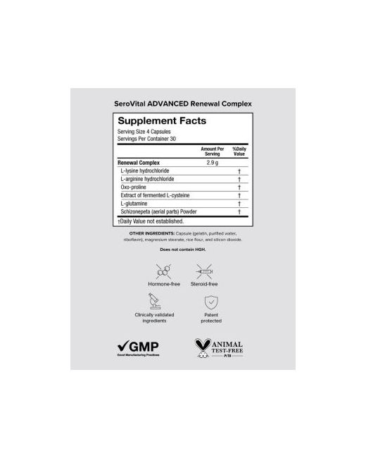 What It Is:A 2-part system that boosts hGH naturally. What It Does:Through rigorous research, SeroVital unlocked a unique amino acid combination that works to create change from withinwithout hormones or harmful ingredients. SeroVital Advanced contains ingredients designed to reduce fine lines and wrinkles, visibly smooth your skin, and imporive skin elasticity in just 15 days. Plus this system boosts mental acuity, decreases body fat, improves sleep, and increases energy. SeroVital Advanced lets you defy age with science. Product Substantiation can be provided at a later date. In separate studies on key ingredients, 100% had improved skin hydration, smoothness, and elasticity. 98% lost an average of 1 pound per week after 8 weeks. 65% decrease in time awake at night.Key Ingredient:- Renewal Complex, a clinically validated blend that boosts hGH naturally.- Ceramides, hyaluronic acid, collagen peptides, and keratin peptides to transform your skin- Coffee bean extract helps increase energy, improve mood, and enhance focus- Wild mint, lady's mantle, olive leaf, and cumin extracts with Smart Release Technology for all-day action to help control cravings and support weight loss.