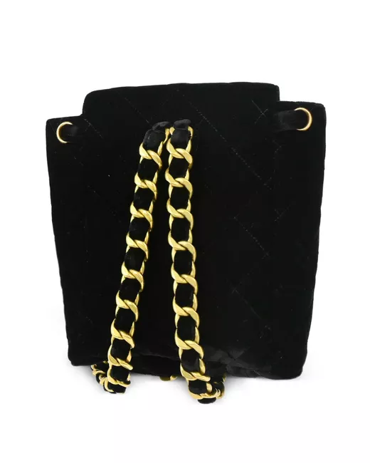 circa 1995 black velvet diamond quilting front flap closure signature interlocking CC turn-lock fastening drawstring fastening two chain-link shoulder straps main compartment front flap pocket gold-tone hardware Serial Number: 3090207 Condition: GOOD. This previously owned and used item is in good condition with minimal signs of use. This may include fading of material or plating and scratches.