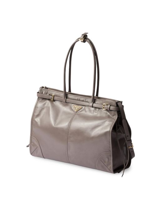A pragmatic but refined design defines this handbag made of soft leather with a shiny finish that emphasizes its modern, versatile allure. The clean-lined silhouette blends different influences into one style with a sleek, distinctive aesthetic. Embellished by the sophisticated detail of narrow straps, the roomy bag has an interior equipped with zipper pockets. The enameled metal triangle logo completes the look with its iconic signature. Leather handles, 22 cm drop Detachable, adjustable leather shoulder strap Metal hardware Enameled metal triangle logo on the front Nappa leather and logo-print nylon interior with center zipper pocket and zipper pocket Imported SIZE 42.0W x 30.0H x 12.0L Shoulder strap: Maximum length 130 cm, minimum length 110 cm, maximum drop 60 cm, minimum drop 50 cm. Lsd Handbags - Prada Handbags Access > Prada > Saks Fifth Avenue > Barneys. Prada. Color: Grey.