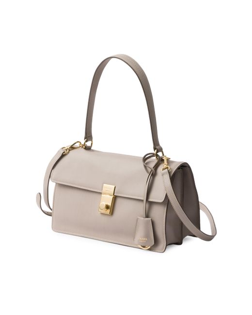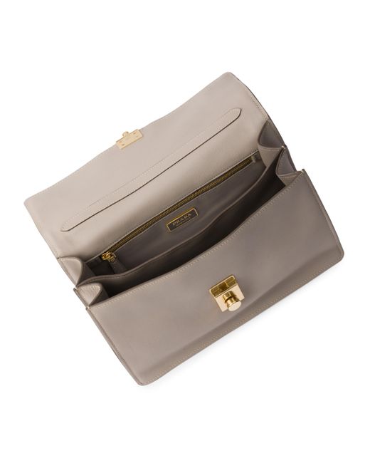 Inspired by rigid, formal work bags, this leather bag is a reinterpretation of the classic office silhouette with a new attitude. The archetypal shape is softened and enriched with sophisticated, feminine details. The vertical clasp, taken from the archives, embellishes the accessory characterized by a long handle that can be worn over the shoulder. Leather handle Detachable, adjustable leather shoulder strap Metal hardware Lettering logo engraved on clasp Flap closure with push-lock clasp Nappa leather lining with two compartments and two pockets, including one with zipper Imported 100% Calf Leather 11'' W x 6.3'' H x 3.9'' L. Lsd Handbags - Prada Handbags Access > Prada > Saks Fifth Avenue > Barneys. Prada. Color: Grey.
