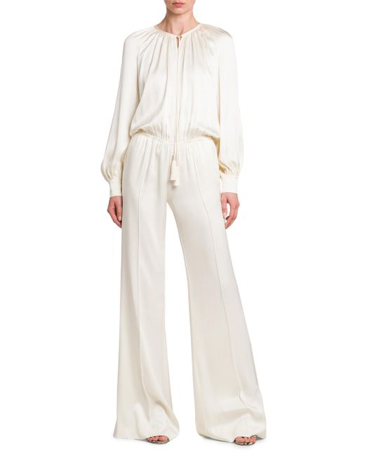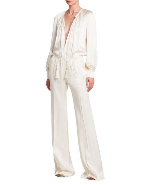 Crafted of Italian silk, TOM FORD's romantic double-knit jumpsuit showcases a poet-style blouse with a self-tie keyhole and a seamed flared leg. Crewneck Long blouson sleeves Keyhole self-tie bodice Elasticized waist Pulls on 100% silk Lining: 100% linen Dry clean Made in Italy SIZE & FIT Model measurements: 5'10" tall Model is wearing a US size 4 ABOUT THE BRAND After 10 years of serving as the Creative Director for several international luxury fashion houses, Tom Ford launched his own line of optical frames, sunglasses and beauty in 2005. The following year he debuted menswear, and in 2010, women's ready-to-wear. His sleek, tailored aesthetic has since catapulted him to mega-brand status. Advanced European - Italian Collections > Tom Ford > Saks Fifth Avenue > Barneys. TOM FORD. Color: Grunge White. Size: 2.