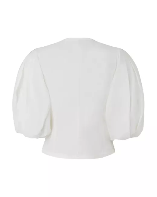 white front button fastening round neck three-quarter length puff sleeves curved hem