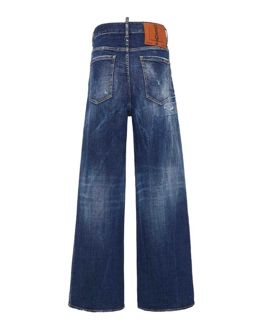 Indigo blue washed denim distressed effect ncled fly and button belt loops classic five pockets wide leg mposition