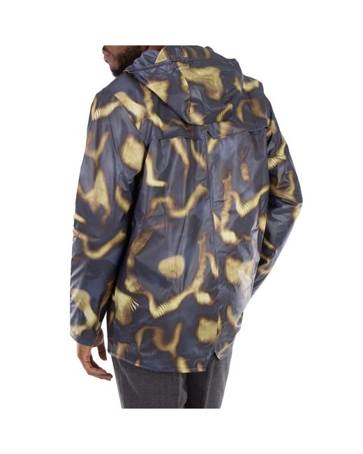 Rains Mens Outerwear. Fashion category: Coats & Jackets. SKU: 12010-MORPH. Color: Morph. Rains Mens Morph Rain Jacket. Cut from Rains' signature PU fabric, this jacket features welded seams, a placket with snap fastenings for closure, and a hood with a built-in cap. It includes two side pockets with snap closures, sleeves finished with adjustable snaps for a looser or tighter fit, under-arm eyelets, and a back yoke with concealed vents for added ventilation. 100% PES (Polyester).