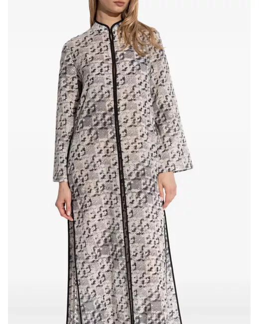 almond beige full-length design high neck front hook and eye fastening long sleeves side slits contrasting trim detailing lightweight construction relaxed silhouette