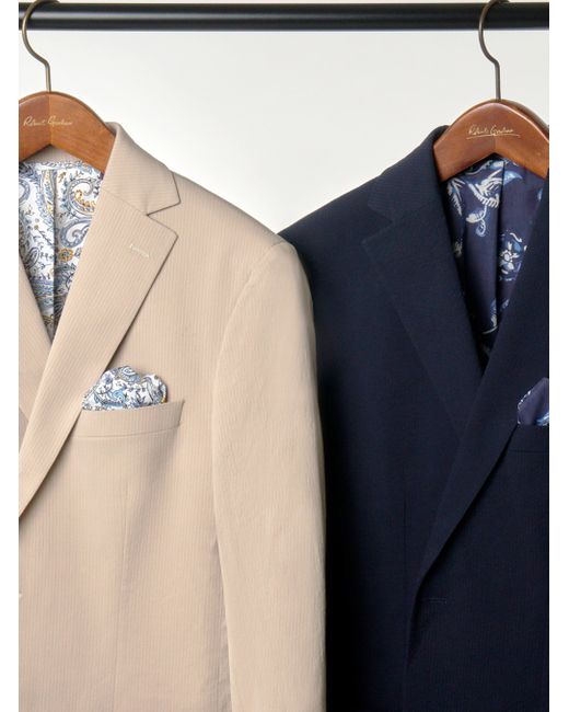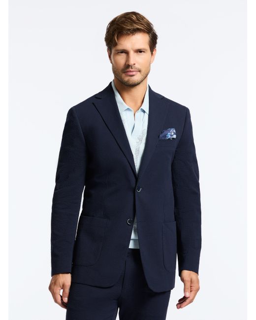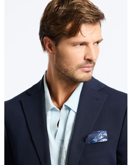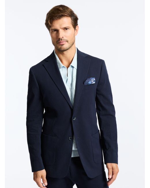 A seersucker blazer is a wardrobe essential. Notice the thoughtful details, like the pearlescent buttons and chest pocket at front. An elegant interior lining adds a bold finishing touch. Pair back to our matching seersucker pant for a coordinated ensemble that's perfect for everything from weddings to garden parties. Notch lapel with button front Long sleeve with lightly padded shoulder Chest pocket Besom pockets at front Interior lining Interior pockets Rear side vents 98% cotton, 2% lycra Dry clean only Imported
