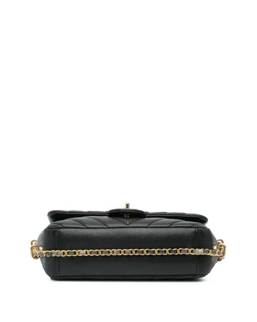 This crossbody bag features a quilted lambskin leather body, a leather woven chain shoulder strap with leather guard, a front flap with CC turn-lock closure, and an interior zip pocket. Black. Serial Number: 25301092. This item has no inclusions. Condition: GOOD. This previously owned and used item is in good condition with minimal signs of use. This may include fading of material or plating and scratches. Please refer to the photos on this product page for a detailed view of the item, including any damages declared.
