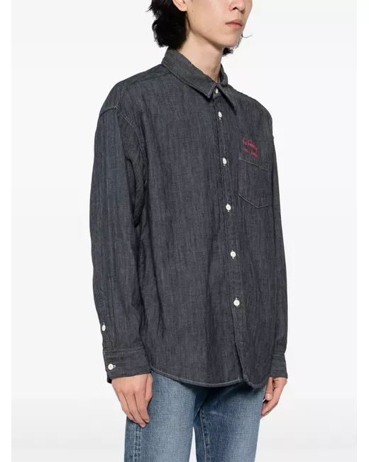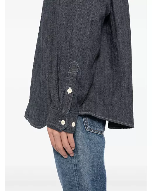 indigo blue front button fastening chest patch pocket buttoned cuffs curved hem