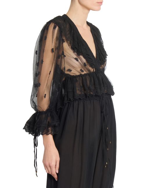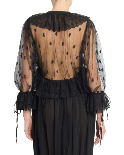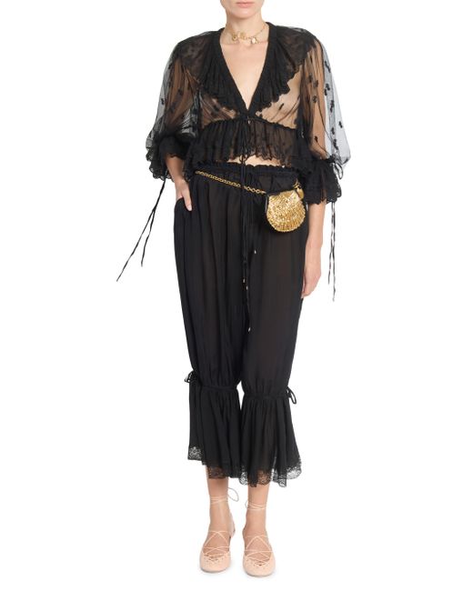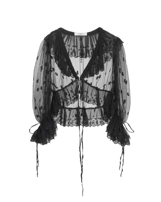 Chloé's sheer lace top showcases ruffle detailing along the V-neck and flared cuffs, finished with self-ties. V-neck Long sleeves, ruffle tie cuffs Front self-tie closure 100% polyester Braid: 53% polyester/47% silk Collar: 100% silk Dry clean Imported SIZE & FIT Model measurements: 5'10" tall Model is wearing a US size 4 ABOUT THE BRAND In 1952, founder Gaby Aghion established Chloé as an alternative to couture, and to appeal to the aspirations and empowerment of women. The label is now led by Creative Director Chemena Kamali, who furthers its signature aesthetic of cool, French-girl style. Advanced Designer - Chloe Rtw > Chloé > Saks Fifth Avenue > Barneys. Chloé. Color: Black. Size: 2.