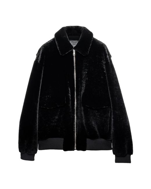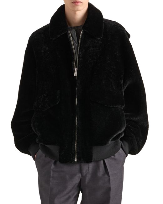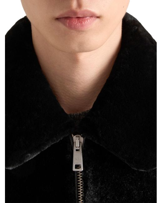 Unlined Oversized fit Center zipper closure Shirt-style collar Straight sleeves with ribbed knit cuffs Flapped pockets Ribbed knit hem Leather triangle logo on the back 100% Ovis Aries Aries Fur type: Sheep Fur Origin: South Africa Imported. Lsd Rtw - Prada Rtw > Prada > Saks Fifth Avenue > Barneys. Prada. Color: Black. Size: 38.