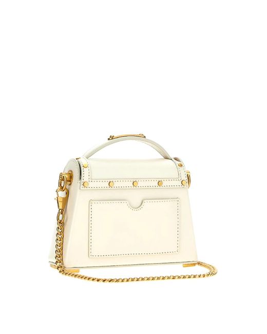Cream colored bag to carry by hand shoulder or crossbody with engraved tag flap with quarter, turn b, twist zip pocket and card holder in embossed
