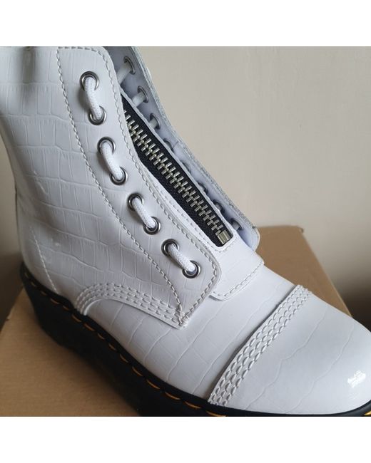 White Patent Croc Emboss. Dr Martens. Patent Lamper Croc Emboss is a coated leather with a high shine, glossy finish. Itās embossed with a faux-croc scale pattern. Kitted out with a removable jungle piece zip, yellow welt stitching and tonnes of Docs attitude.