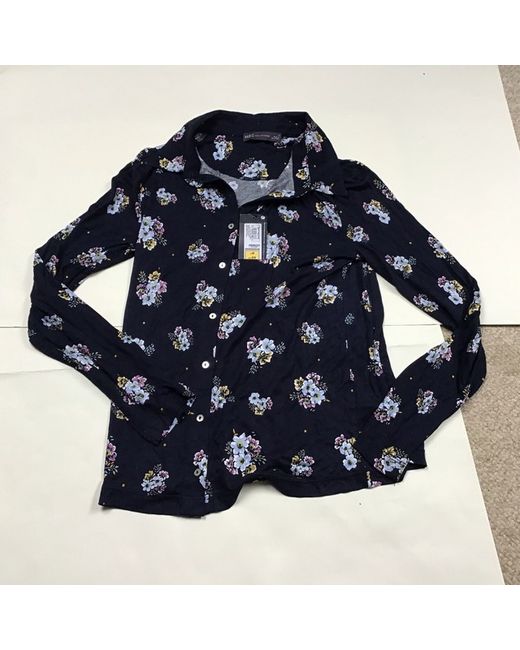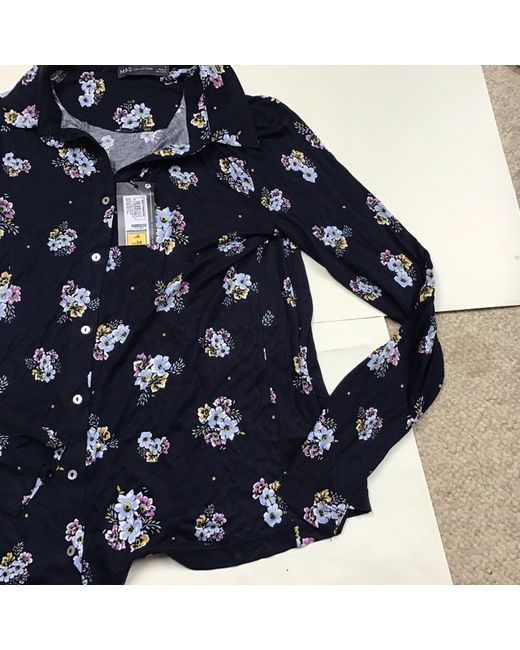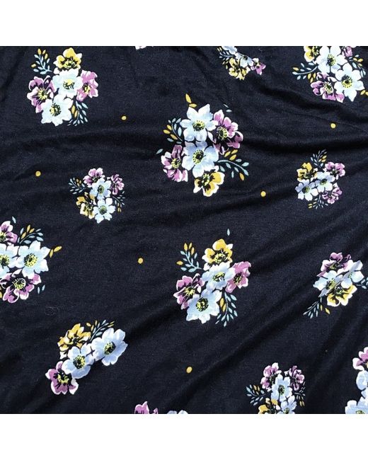 It has a lovely soft jersey feel and a slight stretch. It has a navy background with a repeated floral pattern and small yellow dots.