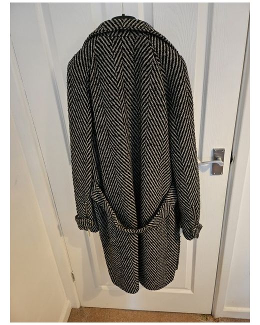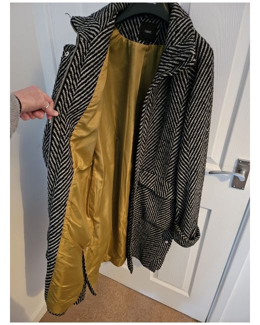 Next womens long coat in grey pattern with orchre lining, worn only once with no defects