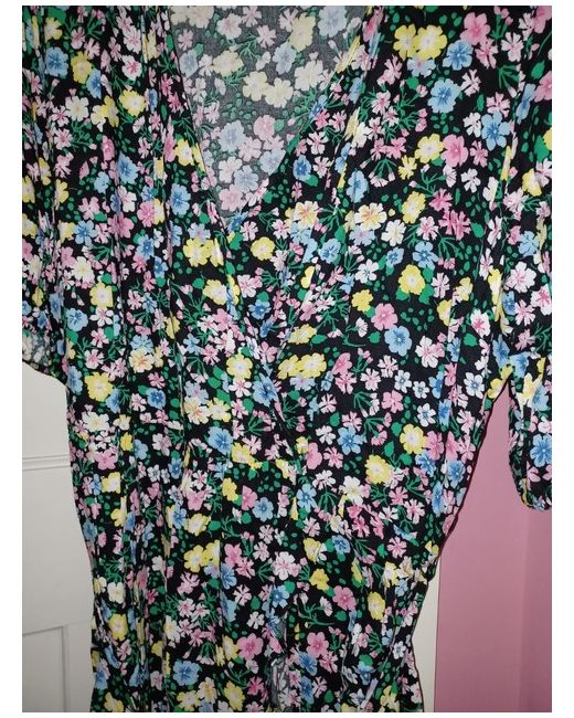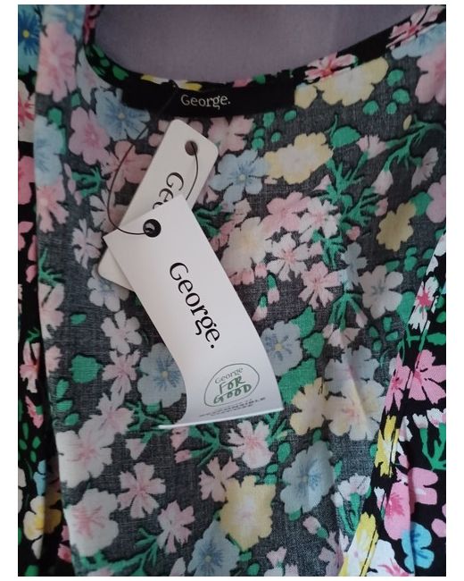 This beautiful George dress features a stunning black floral pattern that is perfect for any occasion. The knee-length dress has a mock wrap style with a V-neckline and short puff sleeves, adding a touch of femininity to the overall look.