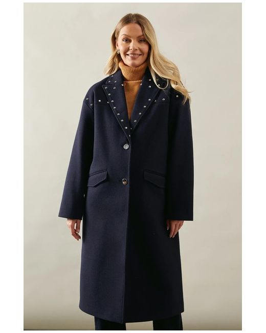 Perfect for the woman who appreciates glamour without compromising on comfort, this coat is a versatile addition to any wardrobe. The studded detailing adds a subtle edge, making this coat a standout piece for smart-casual gatherings or sophisticated soires.