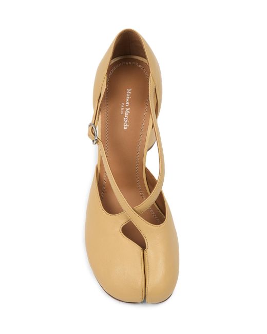 Maison Margiela's Tabi pumps are crafted of leather, featuring a distinctive split-toe design and buckle straps. The leather lining ensures a comfortable fit, while the stacked wooden heel adds height and sophistication. Split toe Buckle closure Leather upper Leather lining Leather/rubber sole Made in Italy SIZE Stacked heel: about 3.2" (80mm). Women's Shoes - Designer Womens Shoes > Maison Margiela > Saks Fifth Avenue > Barneys. Maison Margiela. Color: Beige. Size: 6.