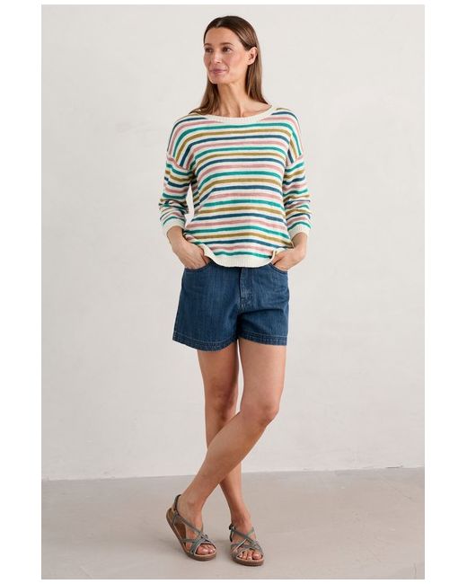 Knavock Striped Jumper. A relaxed-fitting jumper in cool and comfortable cotton linen slub yarn with a beautiful natural texture. This striped, textured knit has a simple boat neck and 3/4 length sleeves and is finished with rib detailing on the neckline, cuffs and hem and functioning buttons on the back.