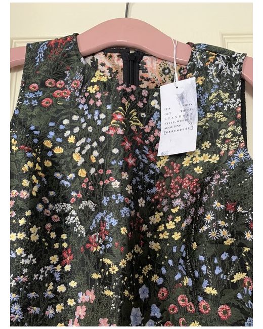 Warehouse Dress Size 12. Beautiful dress. Floral pattern. Prefect for summer/spring/wedding/christening/holiday etc. Hugs the figure to show off curves with a flippy skirt hem. Never worn as my goal to slim to get in it was never achieved so it is with sadness I sell.