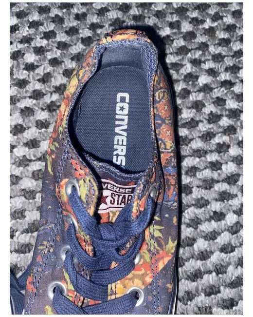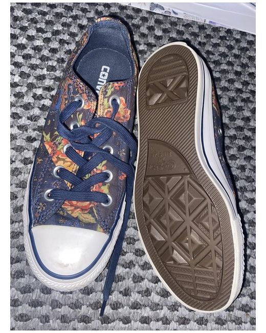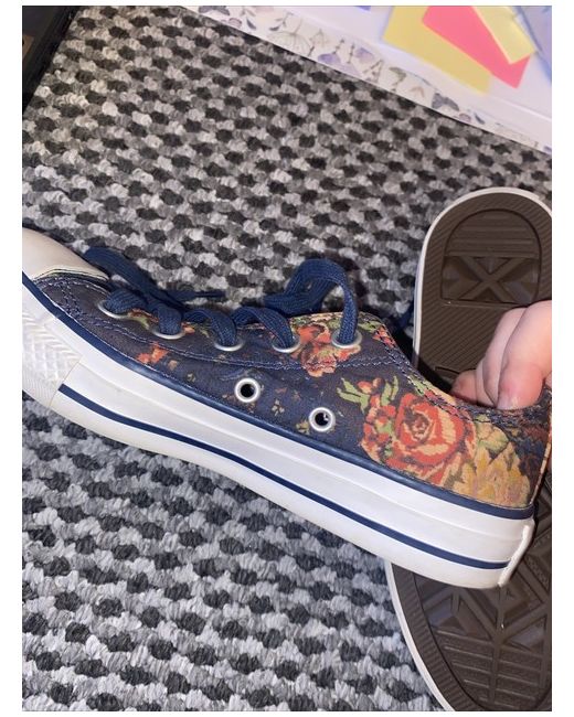Size 3 shoes (women’s or children’s), never worn, only defect is very small scuff on white rubber at front. Limited edition from around 10 years ago, featuring a floral and abstract pattern with red and orange flowers on a navy background, with navy laces and silver eyelets. Really unique but still the classic converse style!