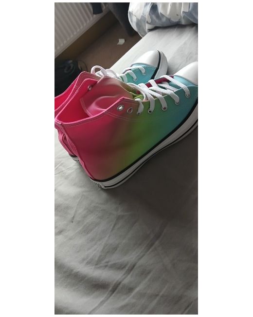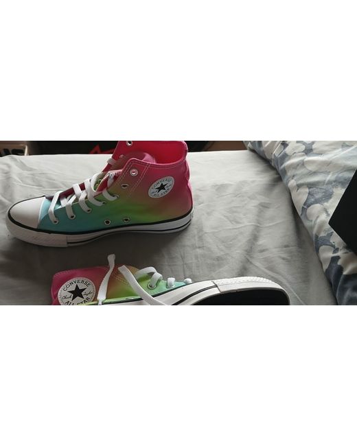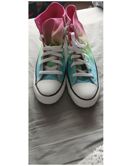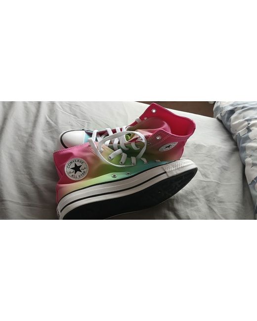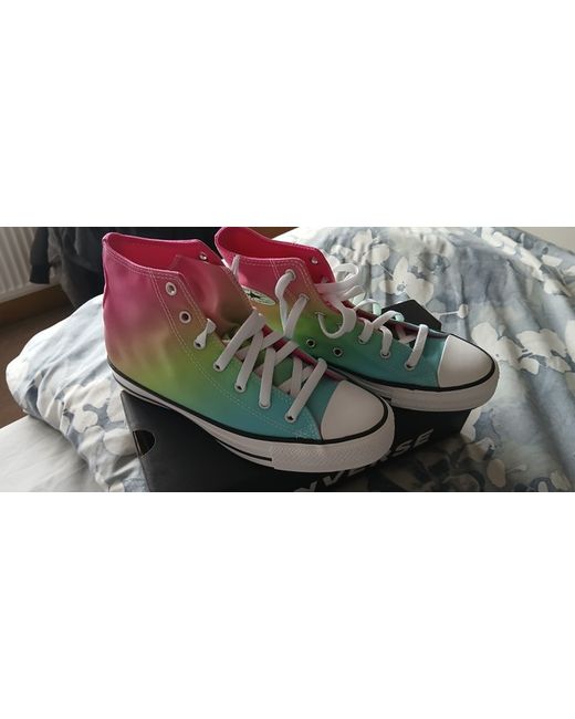 The product is a pair of Converse high top trainers in a multicoloured design, specifically designed for girls or ladies in a UK size 5.5. These sneakers offer a stylish and comfortable option for casual wear, with the classic high top shoe shaft style and iconic Converse branding. Perfect for adding a pop of colour .