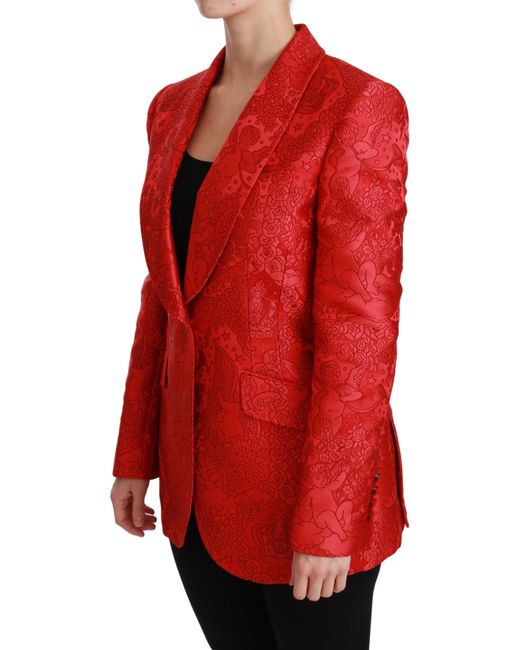 Step into the limelight with this stunning Red Floral Angel Pattern Blazer from Dolce & Gabbana. Exhibiting Italy’s rich craftsmanship, this single-breasted coat blazer is beautifully designed with a vibrant red floral angel pattern, perfect for those who want to make a statement. The exquisite red silk stretch inner lining ensures utmost comfort while the sharp one-button closure adds to the sleek silhouette. Proudly flaunting logo details, this jacket exudes luxury and is bound to turn heads at any high-end event. Color: Red Material: 100% Polyester Lining: 94% Silk, 6% Elastane Country of origin: Italy